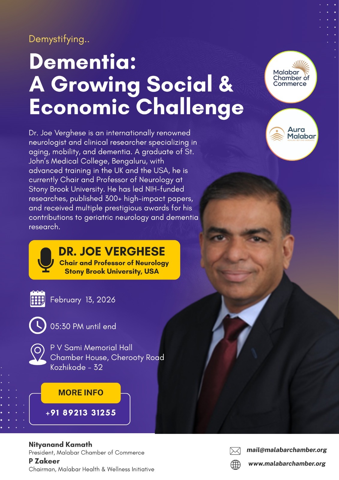 Join us for an insightful talk by Dr. Joe Verghese, internationally renowned neurologist and Chair & Professor of Neurology, Stony Brook University, USA, as he sheds light on dementia, aging, and its wider impact on society.